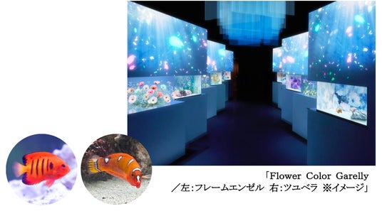 7つの小水槽には初夏の花の“カラー”にちなんだ魚たちを展示。例えば、水彩タッチで描かれた真っ赤なダリアを背景に舞泳ぐのは、朱色をまとう「フレームエンゼル」と「ツユベラ」。さらに、奥に進むに連れて初夏の前・中・後期に旬を迎える花の水槽が順番にご覧いただけ、季節感を色濃くご体感いただけます。