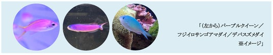 中央の水槽は、花の香りに誘われる“蝶”をイメージした“チョウチョウウオ”のなかま「ハタタテダイ」、花びらのように可憐な「ルリスズメダイ」「スミレナガハナダイ」を展示。それぞれ美しく舞泳ぎながら、この先に広がる“花咲く海の庭園”へゲストを誘います。