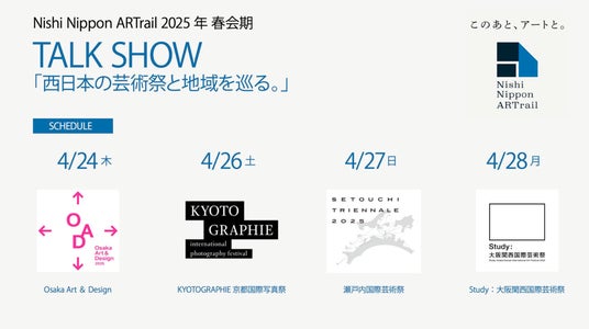『Nishi Nippon ARTrail』は、大阪駅直結の商業施設「ルクア大阪」を運営するJR西日本SC開発株式会社(大阪市北区梅田)が立ち上げた新しいプロジェクトで、西日本エリアの芸術祭やデザインイベントをつなぎ、旅行や日常の中でアートを通して各地の魅力を再発見することで、一人ひとりに合った豊かさの提供をめざします。プロジェクト第一弾となる2025年春期会では、「瀬戸内国際芸術祭」「KYOTOGRAPHIE 京都国際写真祭」「Study:大阪関西国際芸術祭」「Osaka Art & Design」と協働します。