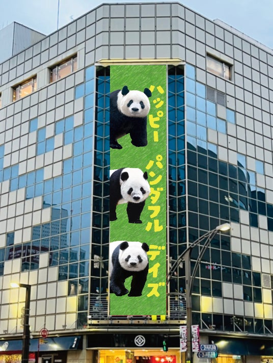上野広小路交差点側外壁に縦約20m×横約4mのシャンシャン、シャオシャオ、レイレイの広告幕が登場!