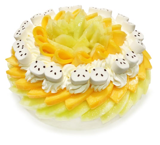 メロンとマンゴーを使用し、可愛らしいマシュマロパンダを飾ったショートケーキです。