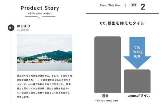 原料のルーツや活用に込められたストーリー、そしてCO2削減量といった環境貢献の指標を、視覚的にわかりやすく表現しています。 製造側でしか見えない原料の回収やタイルの製造工程、そして最終的に店舗で活用されるまでの流れを、ひとつひとつの背景や意味と合わせて丁寧に紐解いています。これにより、「リサイクル製品を導入しても、その背景や意義が社会や顧客に十分伝わらない」といった課題に対し、単なる製品提供にとどまらず、「伝わるサステナブル」の実現までを一貫して支援しています。