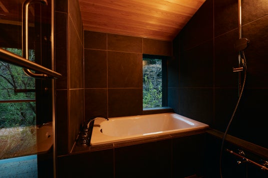 となり、テラスは奥多摩の自然とつながる場所としての役割を果たしています。バスルームでは、庭や対岸の緑を眺めながらゆっくりと入浴し、リフレッシュしていただけます。