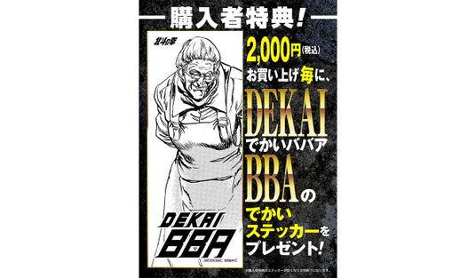 さらに、2,000円(税込)購入ごとに、先着で「でかいババアのでかいステッカー」をランダムで1枚プレゼントする。数に限りがあるので、欲しい方は早めに開催店舗に足を運ぼう。