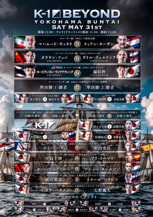 5.31「K-1 BEYOND」横浜大会、本戦16試合の対戦カード&試合順が決定!メインに第5代K-1クルーザー級王座決定戦でサッタリvsターザンの因縁マッチ