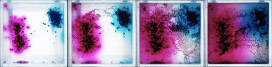 粘菌は、明確な主体性を持たずに環境との応答関係のなかで樹状のパターンを形成し、食物を摂取しながら移動し、排出物によって軌跡を描きます。
