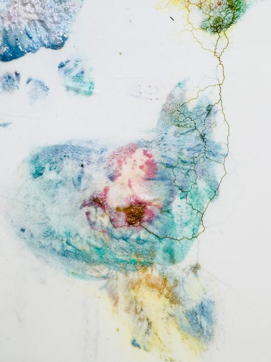 きらきらのグリッターは齋藤の身体に塗布された時には「化粧」や「装飾」といった文化的表象として機能する素材ですが、真性粘菌が代謝する過程では「マイカ(雲母)」や「酸化チタン」といった自然界の鉱物や金属酸化物などの物質へと還元されます。また、布に残った齋藤の痕跡は離れて見れば等身大の身体パー ツとして認識される一方で、近接視ではサフマン・テイラー不安定性によるパターン形成や、真性粘菌の代 謝による樹状の痕跡が交差し、人工物と自然物の境界を解きほぐすような視覚効果を生み出しています。“自然と文化という古典的二項対立をより流動的なものとして捉えたい”と語る齋藤の実践の中でも、とりわけ新たな魅力を放つ作品です。