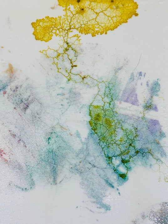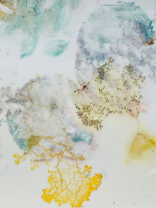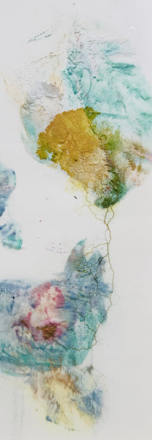 本展は、私の身体パーツを版としたプリントを粘菌に摂取させることで、排出痕と物質摂取の動態が可視化される〈Mutual Traces〉と、粘菌が色素を含む食物を摂取することで、軌跡がリアルタイムに絵画として生成されていく〈Eaten Colors〉の二つのシリーズで構成されています。