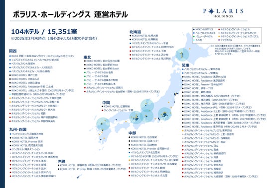 ポラリス・ホールディングスは、これまでオリジナルブランドである「KOKO HOTEL」、グローバルホテルブランドの「Best Western」、東北地方を中心にロードサイド型ホテルとして展開する「バリュー・ザ・ホテル」及びフィリピン共和国において「Red Planet」のブランドのもと国内外でホテルを展開してきましたが、「ホテルウィングインターナショナル」及び「テンザホテル」を展開する株式会社ミナシアと2024年12月に経営統合し、国内外で104店舗15,351室のホテルを展開しています。