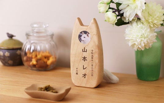 撫でて話しかけたくなるペットのための位牌。写真・名前・没年月日・年齢・メッセージなどを記すことができます。
