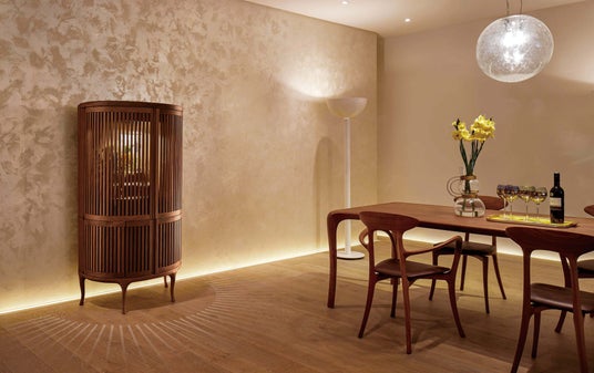 無垢のウォールナットを削り出した格子扉が曲線を描く姿は、芸術作品そのもの。