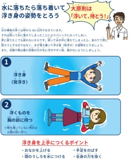 当日は、服を着たまま水に入る体験を通じて、「浮いて待つ」ことの重要性や、水中での動きづらさ、衣服の重さなどを実感してもらいます。これは、ハンドブックにも紹介されている「浮く・待つ・呼ぶ」という命を守る行動の第一歩です。