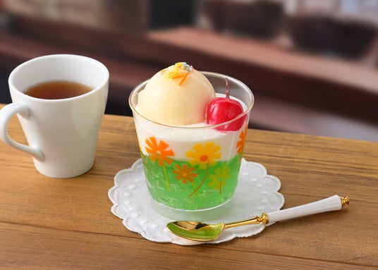 レトロな喫茶店の定番スイーツといえば、クリームソーダ。オレンジと黄色のポップな色使いが印象的な「アリス」柄をデザインしたカップに、メロンソーダ味のゼリーやバニラ風味ムースを盛り付け、さくらんぼを添えたクリームソーダ風のスイーツに。こちらもレトロスイーツの定番、プリンアラモードは、カスタードクリームにプリンゼリーやフルーツを盛りつけ、マーガレットが華やかな「花ざかり」柄のチョコを飾ったタルトに仕上げました。