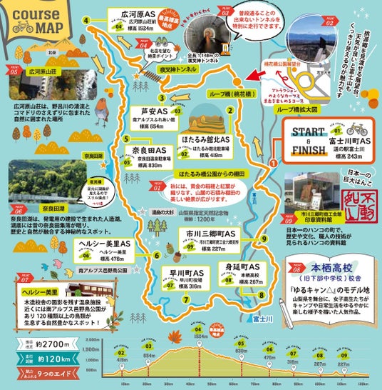 コース :■コース:スタート(道の駅富士川)→南アルプス市→早川町→身延町→市川三郷町→ゴール(道の駅富士川)