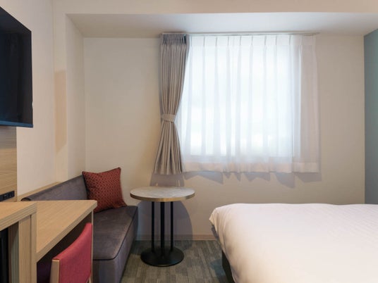 雲海が広がる空の色味をイメージした、やさしい色合いの壁紙が特徴のクイーンルームには、ソファと丸テーブルを備え、2名でもゆったりと快適に過ごせる空間です。