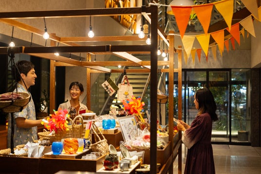知られざる那覇を満喫する「街ナカ」ホテル「OMO5沖縄那覇(おも) by 星野リゾート」は2025年6月1日から、時間を気にせず寝る間際まで沖縄文化に浸れるナイトイベント「琉球のひととき、宵の宴」を365日開催します。好評につき沖縄の伝統工芸の一つ、琉球ガラスを設えた幻想的な空間を拡大し、歌って踊って愉しい「三線ライブ」は毎日開催へ。さらに、宴のお供に選んで楽しい一口サイズの「サーターアンダギーバー」も新登場。また、スタッフが厳選した那覇の逸品を集めた「夜市」も楽しめます。OMO5沖縄那覇ならではの、とっておきの那覇ナイトを過ごせます。