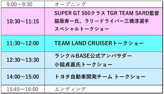 当日は、各ブースの超豪華デモカー展示やグッズ販売をはじめ、SUPER GTのTGR TEAM SARDの監督 脇阪寿一氏と、ラリードライバー三橋淳選手による『スペシャルトークショー』などが行われます。