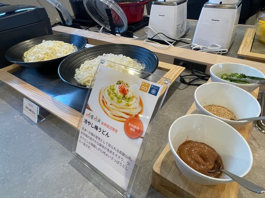 朝食には、地元食材を活かしたメニューを豊富にご用意しており、すべて無料でご提供しています。地域の食材を使用した地産地消メニューとして、紀州産梅を使用した「冷やし梅うどん」や、旬の果物を使ったスムージーなど、多彩なメニューをご提供します。