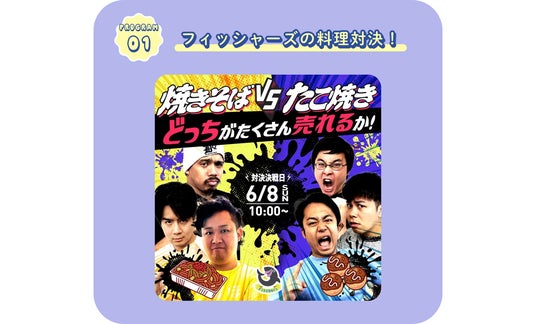 大人気動画クリエイター「フィッシャーズ」がイベントに登場!6月8日(日)10:00より、チーム対抗で焼きそば&たこ焼きの販売対決を実施します。たこ焼きチーム(シルク/マサイ/ダーマ)vs 焼きそばチーム(ンダホ/モトキ/ザカオ)、どちらが多く販売できるかを競います!販売の様子は撮影され、後日フィッシャーズ公式YouTubeチャンネルおよび各種SNSで公開予定。ご来場の際は、ぜひお好きなチームを応援してください!
