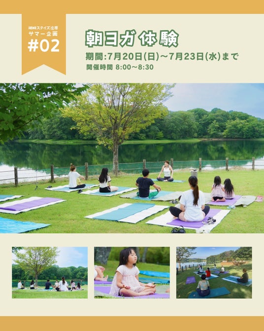 豊かな自然に包まれた里山で、2025年6月1日(日)から8月31日(日)までの期間限定で、夏ならではの特別な体験をご用意。静かな湖畔でリフレッシュ「朝ヨガ体験」、家族みんなで楽しめる「ピザ窯体験」、さらに園内の人気スポット「カブトムシドーム」への入場が無料になる特典など、ここだけの体験が満載です。