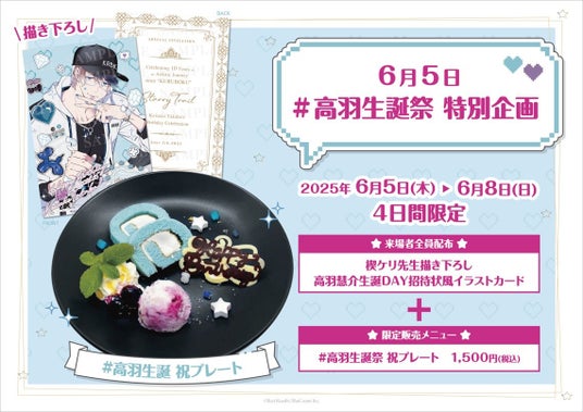 来場者全員配布:楔ケリ先生描き下ろし 高羽慧介生誕DAY招待状風イラストカード限定販売メニュー:#高羽生誕祭 祝プレート 1,500円(税込)