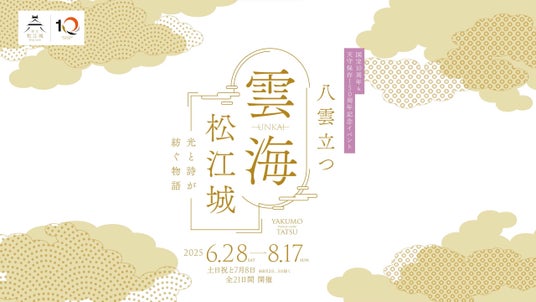 松江城の国宝指定10周年及び天守保存150周年を記念する本イベントでは、最新のスプレーノズル技術を駆使した人工の雲海に、立体音響、プロジェクションマッピングなどの光と映像の演出を融合させ、「八雲立つ」出雲の国の神話性を想起させる幽玄な雲上の松江城体験をお届けします。