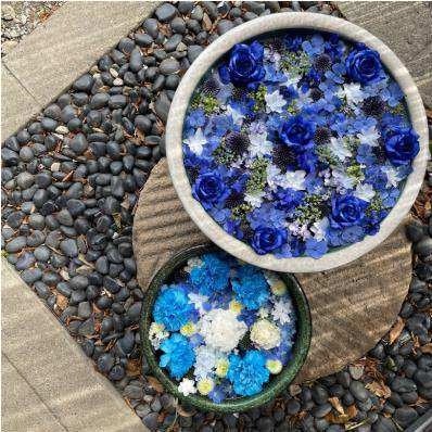 いた睡蓮鉢に色とりどりの花を浮かべたもの。