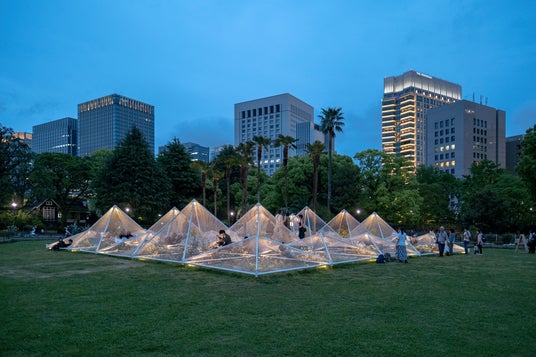 廃棄予定だった漁網を回収し、アップサイクルした糸から作られています。四方を海に囲まれた日本において海洋ゴミによる海洋汚染や生態系への影響は深刻な問題です。本作は、あそびを通じてそうした環境問題に触れることができるインスタレーションです。期間中は夜間にライトアップを実施し、昼間とは異なる表情もお楽しみいただけます。これまでにも東京ミッドタウン、大阪・さくら広場、日比谷公園などで期間限定で設置され、今後もさまざまな場所での展開が予定されております。自然の光や風を感じ、私たちの暮らしと自然環境とのつながりに意識を巡らせるきっかけとなることを願っています。