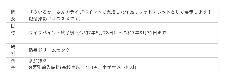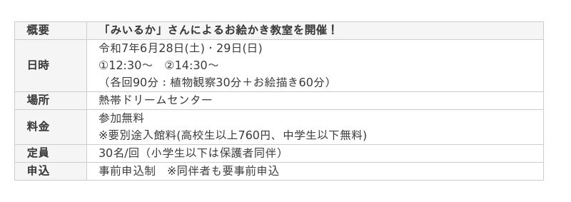 海洋博公園では、SNS等で活躍中の「みいるか」さんによる特別イベント、「お絵描き教室&ライブペイント」を開催いたします。開催場所の海洋博公園内にある熱帯ドリームセンターは、色鮮やかな熱帯・亜熱帯植物や多彩な蘭が楽しめる植物園です。南国ならではの癒しの空間が広がり、遠見台からの絶景も必見です。熱帯ドリームセンターの中で開催される「みいるか」さんの特別イベントへのお越しをお待ちしております。