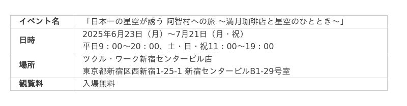 本イベントは、阿智村の豊かな自然と「日本一の星空」と称される夜空の魅力を、『満月珈琲店』の描きおろしイラストや体験型コンテンツを通じて紹介します。七夕の時期にあわせて、東京で幻想的な星空の世界を体感いただけます。