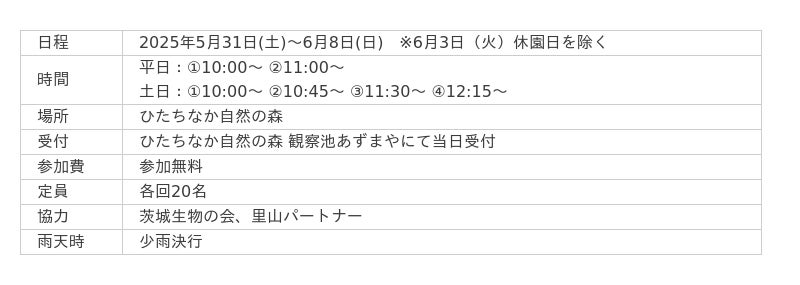 公園ボランティアの「里山パートナー」が、普段は立ち入ることができない自然保護区を中心にオオウメガサソウの魅力や生息環境をご案内する観察会を期間限定で開催しています。下記日程で行っておりますので、お早めのご来園お待ちしております。