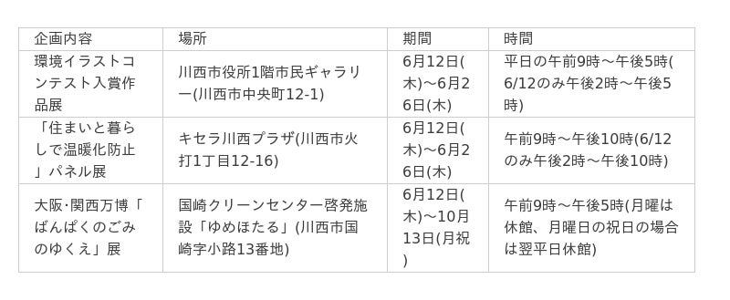 そこで川西市と、猪名川上流広域ごみ処理施設組合、国崎クリーンセンター啓発施設「ゆめほたる」は、環境月間(6月)にちなみ、下表の通り3ヵ所で企画展示を行います。