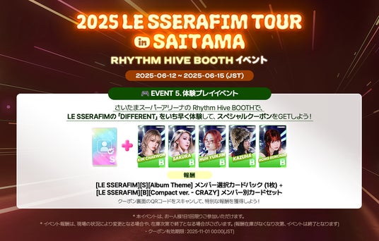 LE SSERAFIMをはじめ、BTSやSEVENTEENなど世界的アーティストを擁するエンターテインメントライフスタイルプラットフォーム企業HYBEのゲーム事業部門であるHYBE IM(所在地:韓国ソウル、代表取締役:チョン・ウヨン)は6月12日(木)と14日(土)、15日(日)に開催予定のLE SSERAFIMのさいたま公演会場「さいたまスーパーアリーナ」にてモバイルリズムゲーム「Rhythm Hive」のプレイゾーンを設置します。