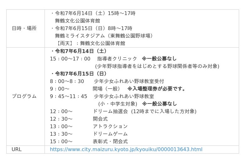 京都府舞鶴市は、一般財団法人自治総合センター宝くじ社会貢献広報事業を活用した事業で、元プロ野球選手による子どもたちや指導者向けの野球教室の開催や舞鶴市民選抜チームと親善試合を行うイベント「宝くじスポーツフェア ドリーム・ベースボール」を2日間にわたり開催いたします。