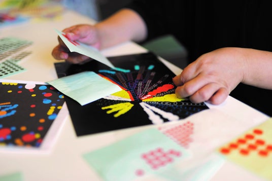 文房具の丸シールを使用して夏の風物詩を描くワークショップ。「ひまわり」「花火」「風鈴」の中から下絵を選び、輪郭線に合わせてシールを貼るだけで絵が完成します。様々なシールを組み合わせて自分だけの夏の思い出を描いてみませんか?