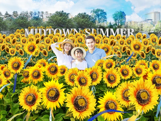 今年は東京ミッドタウンにひまわり畑が出現?! 約2,000本のひまわりとリボンで彩られたフォトスポット「HIMAWARI MID GARDEN」。開放的なガーデンと青空を背景に、風に揺れる色とりどりのリボンに彩られたアーティフィシャルフラワーのひまわりに包まれて、夏の思い出の1枚を撮影ください。夜はライトアップし日中とは違った雰囲気をお楽しみいただけます。