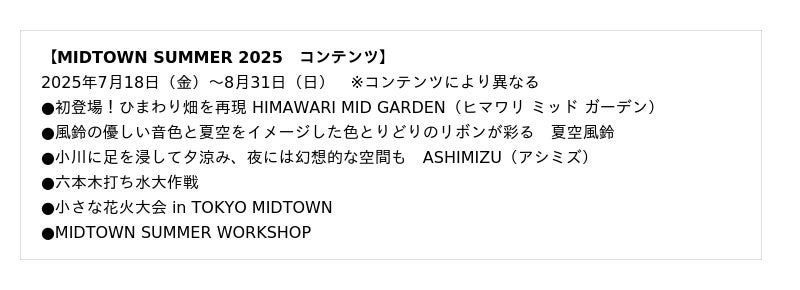 東京ミッドタウン(港区赤坂 / 事業者代表 三井不動産株式会社)は、2025年7月18日(金)から8月31日(日)までの期間、『MIDTOWN SUMMER 2025』(ミッドタウン サマー)を開催いたします。今年は日本の夏景色を体感できるコンテンツを多数ご用意。