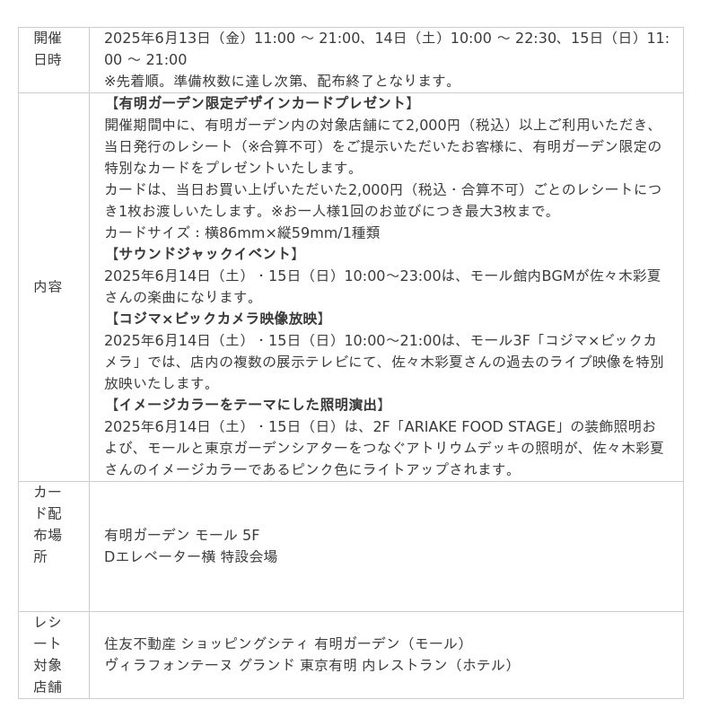住友不動産商業マネジメント株式会社(本社:東京都新宿区、代表取締役社長:山本 直人)は、2025年6月14日(土)に東京ガーデンシアターで開催される佐々木彩夏ソロコンサート「AYAKA NATION 2025 VIP ROOM A⁺ ~the Voyage~」公演にあわせて、複合商業施設「有明ガーデン」(所在地:東京都江東区)にてコラボキャンペーンを実施いたします。