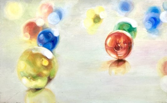 絵はビー玉をモチーフにしています。ビー玉は小さいけれど、光と出会うことで素敵なきらめきを持っていることがわかります。観てくださる方へ、絵を通してご自身やまわりの方が持っている素敵なところに目を向けて、そっと寄りそえる作品になったら嬉しいです。
