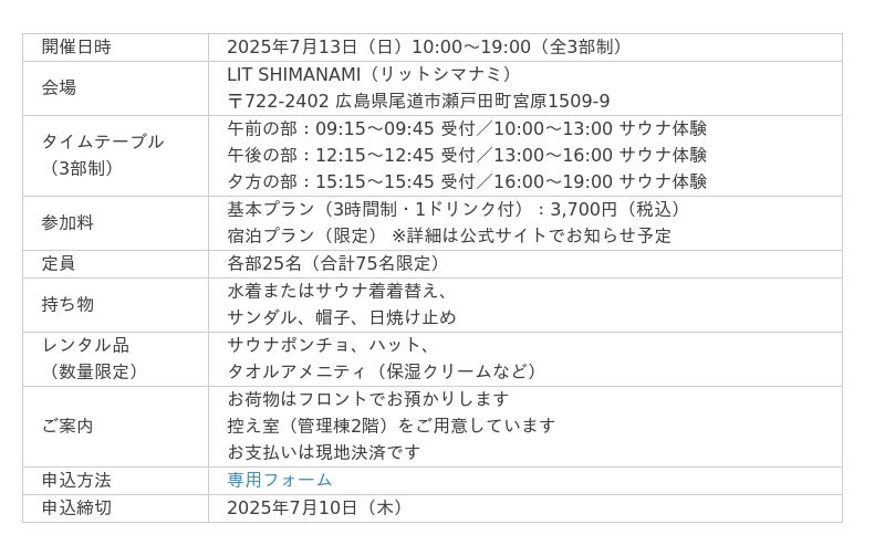 2025年7月13日(日)、瀬戸内・生口島のグランピング施設「LIT SHIMANAMI」にて、海とサウナが融合する新イベント「しまなみサウナフェス2025」を初開催します。全国の人気熱波師が集結し、本格アウフグースを披露。瀬戸内レモンを使った爽快ロウリュウ、インフィニティプールでのクールダウン、絶景とともに楽しむレモングルメ&サウナドリンクなど、“五感でととのう1日”をお届けします。