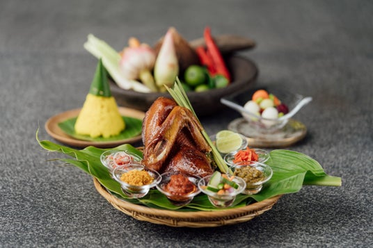 健康的な脂肪分に富むココナッツオイルを使用し、アヒルの半身を素揚げしました。プロテインが豊富で、骨まで食べられます。「ナシクニン」(ターメリックライス)、蒸し野菜を添えて、抗酸化作用のある豊富なビタミン類やミネラルも摂取できます。