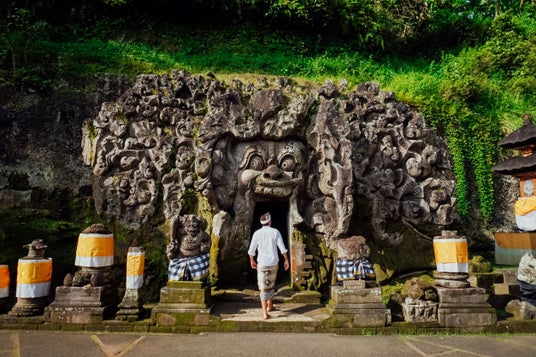 プログラム2日目は、バリのスピリチュアルな世界を体験し、心に刺激を与えます。初めに、星のやバリから車で20分ほどのゴア・ガジャに向かいます。ゴア・ガジャは、神聖なる川や信仰の場を意味する、「ルワガジャ」という言葉に由来するとされます。バリのワルマデワ王朝の11世紀ごろに創建され、古くからヒンドゥー教徒、仏教徒が修行と礼拝の場としてきました。洞窟の入り口は大きな顔が口を開けたような作りで、悪魔から守っているとされます。石窟内にはヒンドゥー教の神、シヴァ、ヴィシュヌ、ブラフマーを表す3体のリンガ、ヨギ、ガネーシャの像が設置されています。この静謐な石窟の中でバリの人々の信仰に思いを馳せ、マインドフルネスを行います。