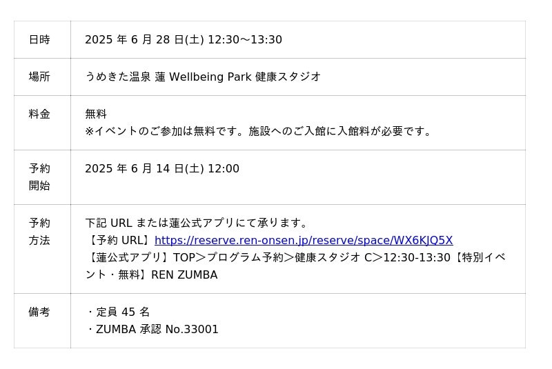 「うめきた温泉 蓮 Wellbeing Park」(総支配人:藤立 達哉、所在地:大阪市)は6月28日に同施設で人気レッスンであるZUMBAの特別イベント「REN ZUMBA vol.2 W★YUI [YUI × 梶原ゆい]」を開催することをお知らせします。本イベントは音楽に合わせて身体を動かしながら心身の健康を促進する、エネルギッシュなフィットネス体験をお届けします。