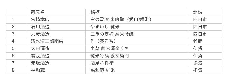 三重県酒造組合に加盟する33の蔵元から、8蔵を厳選して提供します。「種類が多くて選びきれない」といったお声にも応え、初心者にもやさしいセレクションとしました。
