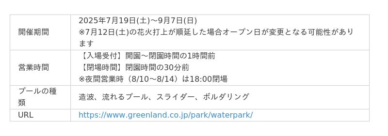グリーンランド遊園地では、今年の夏もプール施設「ウォーターパーク」を7月19日(土)~9月7日(日)の51日間営業いたします。広さ20,000平方メートル の広々としたプールエリアには6つのプール施設があり、0歳児から大人までのびのびとお楽しみいただけます。