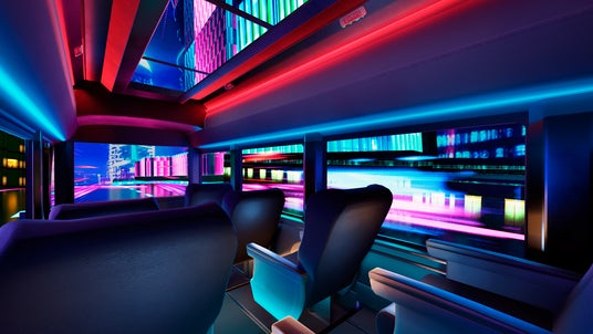 - 最先端XRバスによる圧倒的没入感車内は、正面・天井のディスプレイと左右の窓となる透過ディスプレイで360°囲まれ、実際の風景にAR映像が融合する、ダイナミックで臨場感あふれる視覚体験を提供します。最大乗客数は9名で、ゆったりとした空間でショーに集中できます。