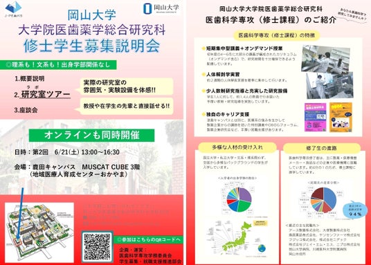 国立大学法人岡山大学(本部:岡山市北区、学長:那須保友)の大学院医歯薬学総合研究科医歯科学専攻(修士課程)では、2025年6月21日(土)13:00~16:30に本学鹿田キャンパスにおいて、概要と入試についての説明を行います。