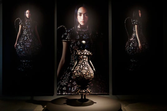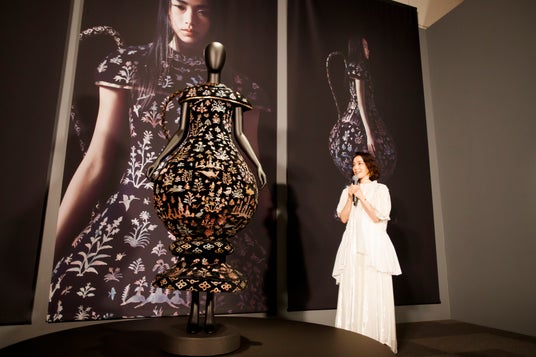 正倉院宝物の一つで、鳥の頭を象った蓋をもつペルシア風の水差し「漆胡瓶(しっこへい)」をモチーフに制作したドレスについて、「漆胡瓶の独特な存在感に魅了され、そのシルエット、オリエンタルな魅力を形にしたいと感じたことが着想になりました。動物や昆虫、植物の文様を手作業でトレース、加工し、400以上のパーツをドレス本体に装飾しました。構想から約1年かけ、纏うアートピースの象徴として、宝物をファッションへと昇華させたのがこのドレスです。文様の細かな表情もぜひ近くでじっくりと見ていただきたいです。」と語りました。