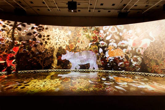 展示会場では、宝物を360度からスキャンして取得された高精細な3Dデジタルデータに演出を加えた映像を幅約20メートルのスクリーンで上映しています。肉眼では捉えにくい宝物の細部や質感も詳しく映し出し、宝物美の世界に没入できます。