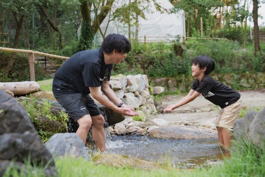 ドームの目の前には、自然の清流を活かした水遊びエリアが広がっています。